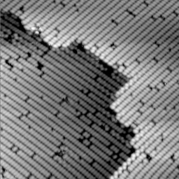 Most chemical reactions not occur in such a controlled environment such as a vacuum chamber. STM can also be used to watch a chemical reaction or physical change occur on a surface under ordinary conditions, room temperature and atmospheric pressure. For example, dissolution of a solid occurs at the solid surface. Put salt in water, and it is the surfaces of the salt crystals that make contact with the water. By obtaining a series of STM images of the same area of a surface exposed to a solvent, it is possible to make a movie and watch dissolution occur. The movie in Figure 7 shows is the dissolution of a crystal of PbS. Note that material is not removed randomly or uniformly from the surface, but is removed preferentially from steps.