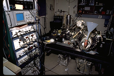 Figure 5. CSTM Vacuum Chamber used by the Hamers Research Group, Department of Chemistry, University of Wisconsin-Madison. Photograph by Jack Markham. Often in STM experiments it is necessary to either maintain a clean surface or control the chemicals that come into contact and react with the surface. Many surfaces will react with the gases in the atmosphere. For example, the surface of aluminum exposed to the air is rapidly covered with an oxide Al2O3. Copper also reacts with oxygen to form copper oxides, such as those responsible for the green color of the Statue of Liberty. While the chemistry of metal oxides such as aluminum is important, it is often the surface of the metal itself that we are interested in. It is possible to obtain an STM image of the pure aluminum metal surface only when the sample is kept in an oxygen free environment.
