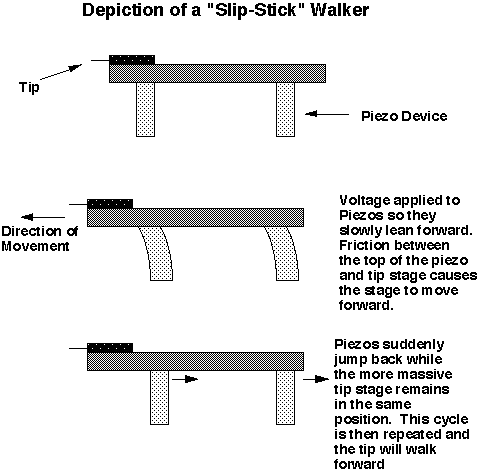 Figure 2. Diagram of a Slip-Stick walker. Once you get the tip within 10 angstroms of the surface and start measuring tunneling current, you need to keep the separation distance constant as you sweep the tip across the surface. This is accomplished with a piezoelectric device (see Figure 3). Piezoelectric materials will expand and contract under an applied voltage. These materials are really not as exotic as you may think. Quartz is a common piezo material and is used in watches and clocks. Piezo devices are also commonly used in stereo speakers, where an applied voltage causes the piezo to move, which moves the speaker element making the sound. Mounting the tip on the end of a piezo device makes highly accurate and precise positioning of the tip possible (adjustments of less than 0.01 angstroms) by applying the appropriate voltage to the piezo. By recording the voltage applied to the piezo necessary to maintain a constant tunneling current, and therefore a constant tip-sample separation, topographic information of the surface is obtained and displayed as an image.