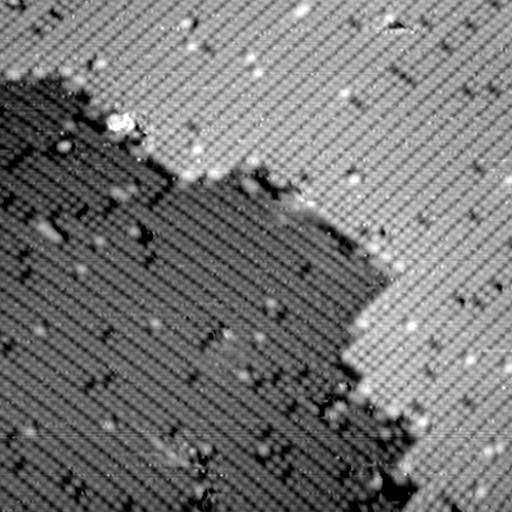 A clean Si(001) surface imaged at sample positive bias of +2.0 V. In other words, the microscope was probing the empty states. This can be linked to the concept of pi* orbitals such as in the carbon-carbon double bond. In that case, one would see a node between the two species in the bond. There are also some defects on the surface that show up as holes and protrusions. The RAW data file is 293 angstroms on a side.