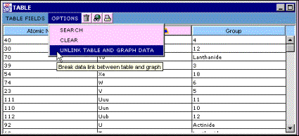 The TABLE FIELDS menu allows you to select or deselect propertie s to be displayed in the table. The function of this menu is similar to that of the X menu and Y menu in the GRAPH window. However, as mentioned above, more propertie s are available for selection. Atomic Number, Element Symbol, Group, and Period are listed in the TABLE FIELDS menu rather than in one of the three submenus.