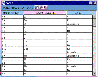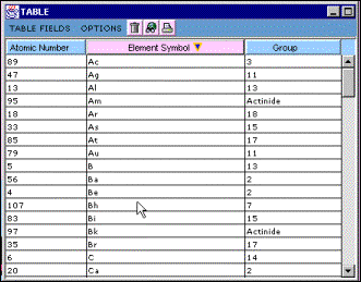 The table is always sorted by one of the columns. The default is data sorted by Atomic Number in ascending order. The header of the column that is sorted is colored pink–all other column headers are blue. The sorting method (ascending or descending) is indicated by a small triangle within the pink column header. If the triangle is pointing down, the column is sorted in ascending order. If the triangle is pointing up, the column is sorted in descending order. Figures 3.4 and 3.5 illustrate a table sorted by the Element Symbol field. In Figure 3.4, the table is sorted in ascending (from A–Z) order. In Figure 3.5, the table is sorted in descending (from Z–A) order.