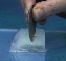 Diamond then Al with ice The first disk seen is a diamond wafer. Body heat from the hand holding the disk is rapidly transferred to an ice cube, enabling the diamond to rapidly melt a path through the ice cube. The second disk seen is made of aluminum. During the same amount of time, the aluminum does not pass as far through the ice cube, due to the lower thermal conductivity of aluminum relative to diamond. |