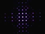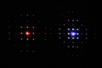 Diffraction square red and blue Diffraction patterns from a square array (see the previous movie) shown using two wavelengths of excitation, red 633-nm light from a He-Ne laser and blue 458-nm light from an argon ion laser; the longer wavelength results in wider spacings between diffraction spots. (Companion Demonstration 4.1) |
