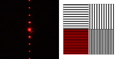 Diffraction lines Diffraction by an array of lines. The diffraction pattern shown is produced when the laser passes through the portion of the slide that is highlighted in red. What is the diffraction pattern of a horizontal array of lines? Of a vertical array of lines? Does an array with a smaller repeat distance give a diffraction pattern with a smaller repeat distance? (Companion Experiment 4) |