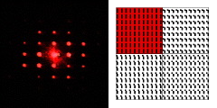Diffraction non-square Diffraction pattern from a square array (see the previous movie) shown using 458, 476, 488, 496, and 514-nm light from an argon ion laser excitation and red 633-nm light from a He-Ne laser; the longer wavelength results in wider spacings between diffraction spots. (Companion Demonstration 4.1) |