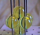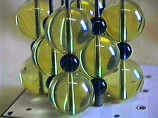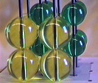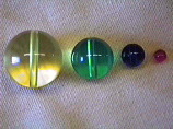 The 4 sizes of spheres in the ICE Solid State Model kit, whose radii reflect ideal packing ratios in many mineral structures. If the clear spheres at the left (1 inch diameter) are packed in the shape of a cube, the green sphere (0.732 inch diameter) fits snugly in the cube's center; if the clear spheres are packed in the shape of an octahedron, the blue sphere (0.414 inch diameter) fits snugly in the octahedron's center; and if the clear spheres are packed in the shape of a tetrahedron, the pink sphere (0.225 inch diameter) fits snugly in the tetrahedron's center. (Companion Figure 5.10)