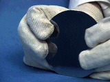 Close up of a silicon wafer flexed until the wafer shatters. The directional covalent bonding of silicon leads to brittleness. Contrast this with bending copper (metallic bonding) and with cleaving NaCl (ionic bonding). (Companion Demonstration 6.1)