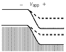 Under forward bias (bottom, middle picture) the barrier is reduced.
