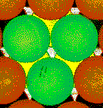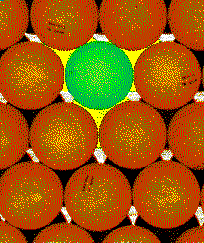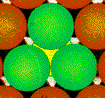 A tetrahedral hole is located at the center of a tetrahedron formed by three anions in the lower layer and one anion in the top layer. A second type of tetrahedral hole is formed by three anions in the top layer and one anion in the lower layer. An octahedral hole is located at the center of an octahedron formed by three anions in the top layer and three anions in the lower layer. Use the links on the right to show 2 types of tetrahedral holes, and an octahedral hole. |