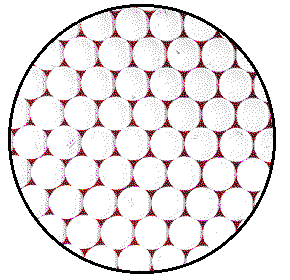 Crystalline solids are composed of atoms, ions, or molecules that are arranged in an extended regular repeating array. Huge numbers of atoms are required to build a cubic millimeter of a solid. The figure shows a model of a plane of atoms in a crystal of platinum metal. To model the actual number of atoms in the 2 mm circle on the crystal, the magnified image would need to be about 8,000,000 atoms wide rather than 8 atoms wide as drawn. A model covered with a layer of 1/2 inch marbles would require a circle with a diameter of about 60 miles. |