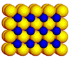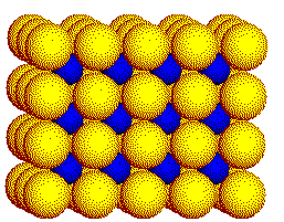 Radii: The radius ratio is such that we expect the cesium ions to occupy cubic holes in an array of chloride ions. The stoichiometry (one Cs+ ion per each Cl - ion) requires that all of the cubic holes be occupied. In fact, the CsCl structure consists of a simple cubic array of Cl - ions with Cs+ ions filling all of the cubic holes. Click on the image at right to view the CsCl structure. The links in the text above go to definitions. |