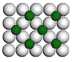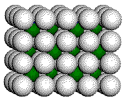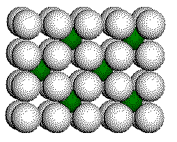 The structure of calcium fluoride, the fluorite structure, can be described as a simple cubic array of fluoride ions with calcium ions occupying half of the cubic holes. Click on the picture to the right to build the calcium fluoride structure. ---> However, the unit cell of calcium fluoride has calcium ions at the corners.
