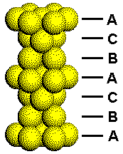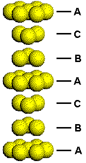This figure shows a portion of a cubic closest packed structure with the layers arbitrarily labeled A, B, and C. Each layer with the same letter has atoms with the same orientation, but the orientations are different in layers with different letters. The difference in the orientation of the three types of planes can be seen by considering how these planes of close packed atoms stack to form a three-dimensional solid. Use the link on the right to either separate or collapse the layers in a CCP structure. |