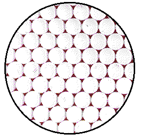 | Crystalline solids are composed of atoms, ions, or molecules that are arranged in an extended regular repeating array. Huge numbers of units of the repeating array are required to build each cubic millimeter of most simple solids. The figure shows a model of a plane of atoms in a crystal of platinum metal. To model the actual number of atoms in the 2 mm circle on the crystal, the magnified image would need to be about 8,000,000 atoms wide rather than 8 atoms wide as drawn. A model covered with a layer of 1/2 inch marbles would require a circle with a diameter of about 60 miles. |