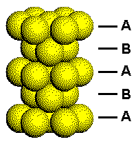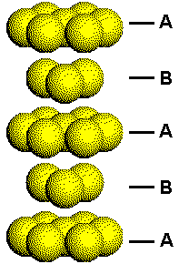 This figure shows a portion of a hexagonal closest packed structure with the layers arbitrarily labeled A and B. Each A layer has atoms with the same orientation. Each B layer has the same orientation, but this orientation is different from that of the A layers. The difference in the orientation of the two types of planes in the HCP structure can be seen by considering how planes of close packed atoms stack to form three-dimensional solids. Click the link on the right to either separate or put the HCP layers back together. |
