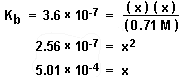 Before proceeding with the calculation, we need to make sure the terms we ignored are negligible. We ignored the contribution from the autoionization of water to the hydroxide concentration; 1 x 10-7 + 5.01 x 10-4 is still equal to 5.01 x 10-4 so the 1 x 10-7 can be ignored. We also ignored the ionization change from the concentration of the hypochlorite ion; 0.71 - 5.01 x 10-4 is still equal to 0.71 so the ionization change can be ignored. |