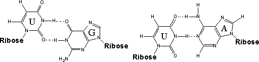 As you can see, A and G can form base pairs with U. The most common pairing is with A, and this is what is found in the process of transcription, but G often forms base pairs with U in RNA molecules (See the DNA 2 module for descriptions of RNA and transcription).