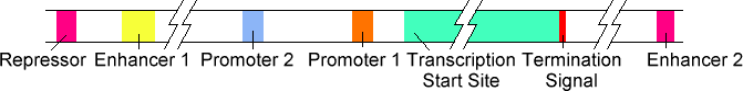 Finally, enhancer and repressor regions around the DNA to be transcribed can increase or decrease the likelihood of transcription. These regions are often hundreds or thousands of base pairs away from the DNA region that will be transcribed, but the DNA is flexible, so the enhancers and repressors wind up close to the transcription start site. Proteins carrying signals from outside the cell often bind to these regions. In this way the cell can start or stop synthesizing other proteins that will allow it to respond to changing conditions in the environment.
