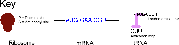 mRNA binds to the ribosome. The AUG start codon sits in a particular site on the ribosome (the P or peptide site) and binds a tRNA with Met bound to it. The second codon, GAA in this example, binds a tRNA with Glu bound in a second site (the A or aminoacyl site).