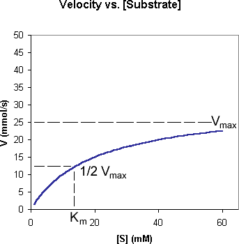 Maximal Velocity (Vmax): Increasing the substrate concentration indefinitely does not increase the rate of an enzyme-catalyzed reaction beyond a certain point. This point is reached when there are enough substrate molecules to completely fill (saturate) the enzyme's active sites. The maximal velocity, or Vmax, is the rate of the reaction under these conditions. Vmax reflects how fast the enzyme can catalyze the reaction. Click on the image at right to see how high Vmax and low Vmax enzymes compare. Vmax is given by the asymptote to the velocity curve as the substrate concentration is extrapolated to infitinity. Notice that Km stays constant for the two enzymes described here.