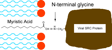 Many proteins are anchored to membranes in the cell by the covalent attachment of a fatty acid. For example, the viral protein src causes cancer in several organisms. An amide bond is formed between the Gly residue and myristic acid, a fatty acid found in cell membranes. The covalent bond keeps the protein associated with the membrane. The ability of src to cause cancer is blocked if the formation of this peptide bond is prevented.
