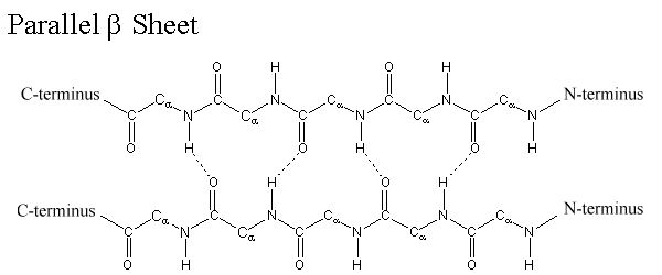 ß SheetsThe other type of secondary structure Pauling and Corey discovered is the ß sheet. Unlike the a helix, the ß sheet is formed by hydrogen bonds between protein strands, rather than within a strand. Some other characteristics of ß sheets are displayed below.