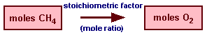 It is often useful to map out a stoichiometry problem. The map for this problem would look like: This map tells us that there is one step to this problem: calculating how many moles of oxygen will react with the given moles of methane. It also tells us that this step can be made by using the stoichiometric ratio (or mole factor). |