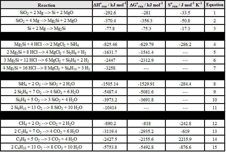 It is interesting to compare the enthalpies of combustion (Figure 1) of each silane (Equations 8-11) to the enthalpy of combustion of its corresponding alkane (Equations 12-15):