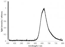 Emission spectrum of McCormick's Sky Blue dye dissolved in water, exited by a 405 nm laser pointer
