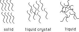 Schematically, the solid liquid crystal has molecules aligned in a repeating pattern. In the liquid, order is lost. In the liquid crystal, there is still orientational order. Phase transitions are observed at 21 and 45 degrees C.