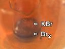 Because of its high reactivity, potassium metal is stored in mineral oil, a relatively inert liquid. The protective coating of mineral oil must be removed from the metal's surface. The soft potassium will then be cut, and a small piece will be picked up with forceps and carefully added to a small beaker of liquid bromine. The large covered beaker prevents the escape of bromine vapor and reaction products into the environment.(36)