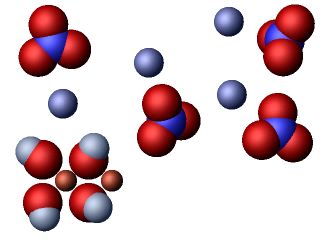This is a representation of the mixture present after the reaction is complete. It shows copper(II) hydroxide solid, sodium ions and nitrate ions.