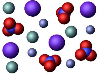 This is a representation of the mixture present after the mixing is complete. It shows potassium ions, iodide ions, sodium ions and nitrate ions.