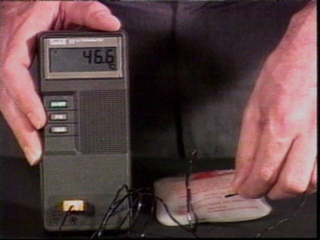 Now a commercial application of this crystallization process is shown. A metal disc is manipulated inside a sealed plastic bag holding the sodium acetate solution. This causes the sodium acetate to crystallize. The digital thermometer shows that the temperature of the heating pack has gone up significantly from room temperature. This heating pack provides an easily portable method of having heat available whenever and wherever it is needed.