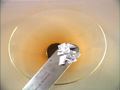 Pieces of aluminum are cut from a strip of foil. Liquid bromine is placed on a watch glass and the pieces of aluminum are added. As the bromine evaporates, brown fumes are given off. At first there is no reaction because of the protective oxide coating on the aluminum. An exothermic reaction between bromine and aluminum causes more brown fumes of bromine to be given off. White fumes are also given off. When a fan is turned on, we can better observe the residue, which consists of aluminum bromide, excess bromine and aluminum. The brown color is caused by the excess bromine.