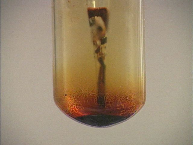 This video illustrates combination of chlorine with iodine to form two interhalogen compounds, iodine monochloride and diiodine hexachloride. (In the solid state iodine trichloride dimerizes and consists of molecules whose formula is I2Cl6; the solid decomposes to ICl and Cl2 when heated.) Iodine monochloride melts at 27 oC, and its formation is exothermic, so no solid is formed, only liquid.