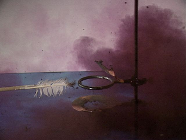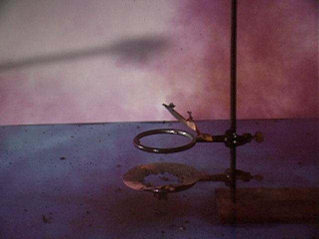 When nitrogen triodide detonates, the products are explosively produced and distributed. The process is shown in reverse. The products of the explosion of nitrogen triiodide "assemble themselves" to form the original system as it was before the explosion. The situation shown is so highly improbable that we would not expect to observe it in nature.
