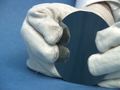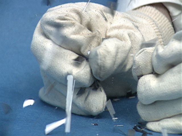 When a silicon wafer is shattered, the pieces are no longer connected. The process is shown in reverse. The shattered pieces of a silicon wafer "assemble themselves" back into the original wafer. The situation shown is so highly improbable that we would not expect to observe it in nature.