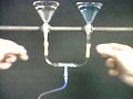 A buffered luminol solution with a copper(II) catalyst is added to the funnel on the left. A hydrogen peroxide solution is added to the funnel on the right. On releasing the rubber tubing the solutions mix. The chemical reaction generates energy which is seen as blue light. This process is chemiluminescence. When the reacting solution mixes with a dye, fluorescein, the light energy from the reaction causes the fluorescein to give off a greenish light in a process called fluorescence.