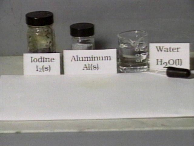 Powdered aluminum and powdered iodine are mixed together and then one or two drops of water are added to the mixture. Shortly after the water is added, a vigorous reaction occurs. There is flame and lots of iodine vapor given off. Some of the iodine vapor can be seen to be reacting to form some other substance because the color is no longer violet but kind of a reddish brown. This vigorous reaction shows that aluminum metal is a fairly strong reducing agent and iodine solid is a fairly strong oxidizing agent.