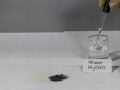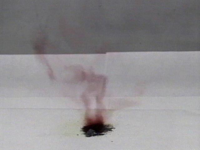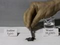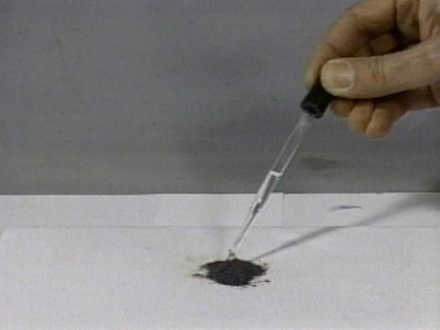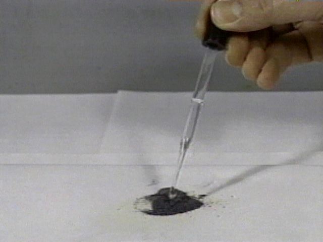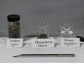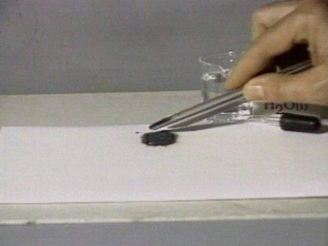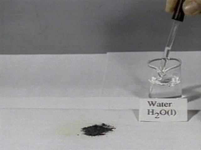 Manganese is mixed with iodine. Notice that the powdered manganese is black, and the iodine is also nearly black. Again there is no reaction just upon mixing the solid materials but as soon as a few drops of water are added, a reaction does take place. Again the reaction is vigorous, but this time there is no flame. By comparison with the aluminum reaction, the manganese reaction was not as vigorous.