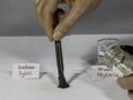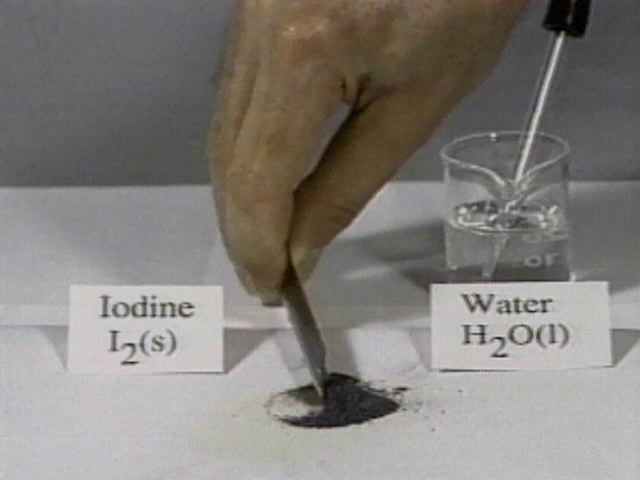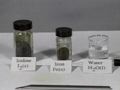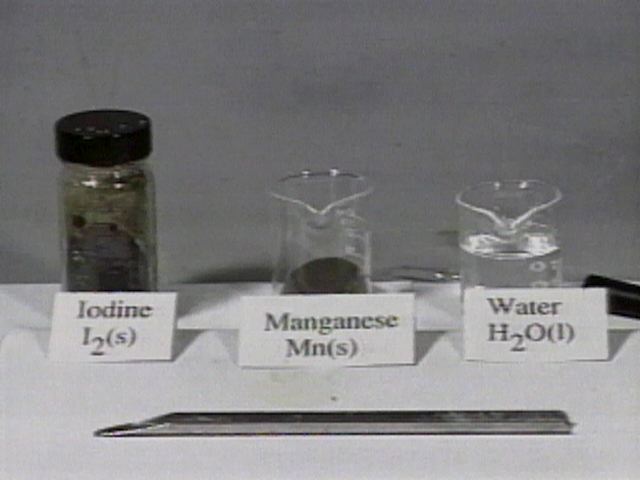 Powdered iron is mixed with some iodine. There is no reaction when the dry solids are mixed together. In this case, adding water initiates a reaction but it is not as vigorous as the reaction of the aluminum or the manganese. Apparently iron is not as strong a reducing agent as these other metals relative to iodine.