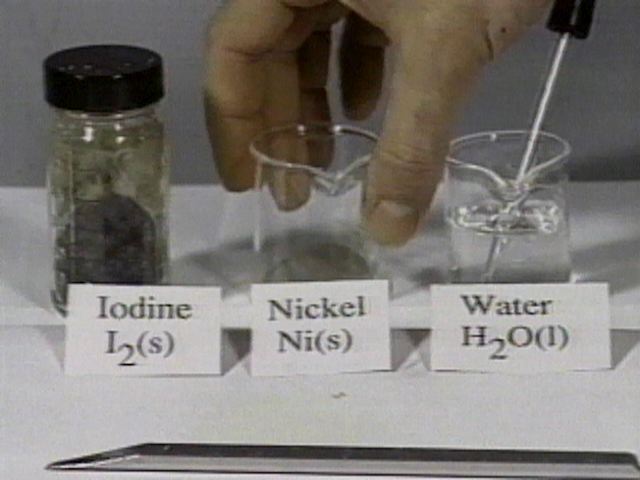 Nickel is mixed with iodine. Even after water is added, there is no reaction between the nickel and the iodine. Apparently, nickel is not a very strong reducing agent compared to the other metals tested.