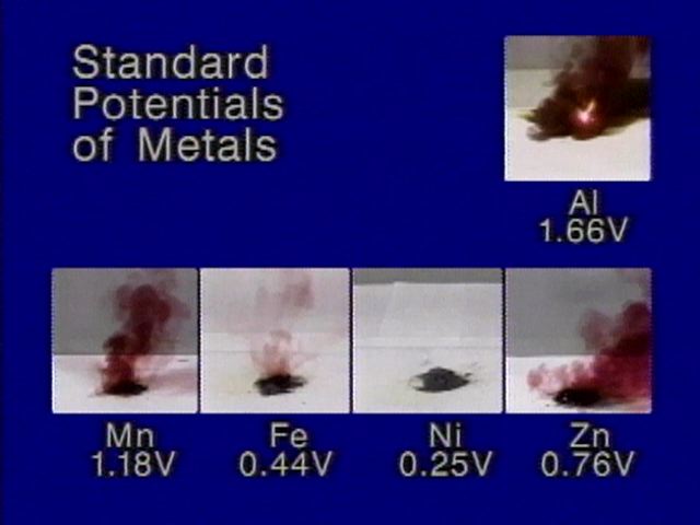 When a small quantity of powdered aluminum is mixed with some iodine crystals and a few drops of water are added, a vigorous reaction ensues, producing purple iodine vapor and flame. Aluminum iodide is the product. Similar reactions occur when the aluminum is replaced by manganese, zinc, and iron, but nickel is shown not to react with iodine under the same conditions. A graphic shows each reaction and the electrode potential of each metal/metal-ion couple.
