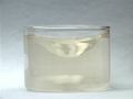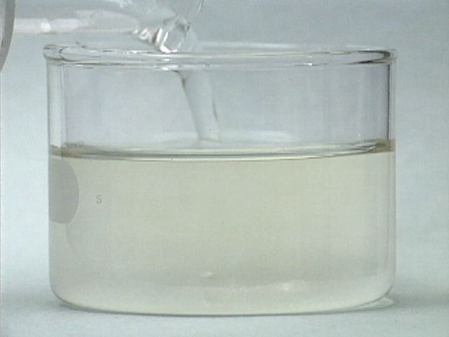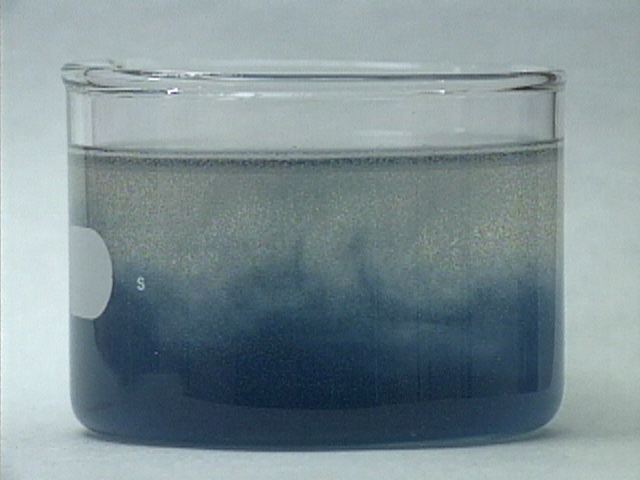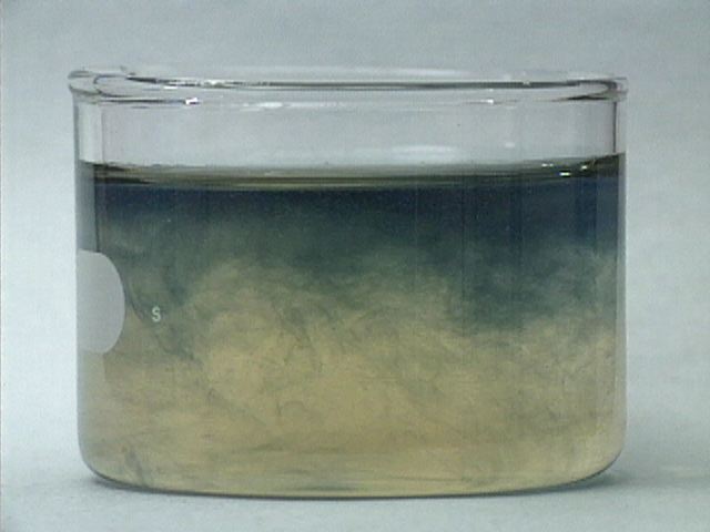 The reaction is repeated without stirring. As a result, the color oscillations are not uniform throughout the mixture. The color change appears to move through the mixture like a wave. The formation of gas bubbles also oscillates.