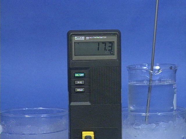 Dissolving sulfuric acid in water is an exothermic process. When sulfuric acid is mixed with ice this exothermic process causes the temperature to rise at first, but as more of the ice melts, the temperature falls. Because a sulfuric acid solution has a lower freezing point than water, the temperature can fall below 0 degrees Celsius if enough ice is present.The following are additional pictures relating to the first movie.