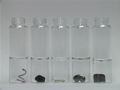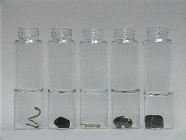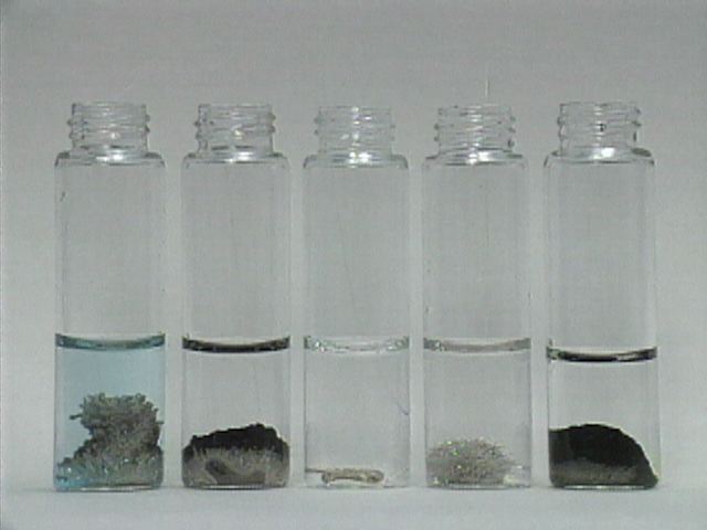 Five different metals have been placed in silver nitrate solutions. Note the formation of silver metallic crystals on the metals' surfaces and the eventual darkening of the crystals.