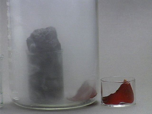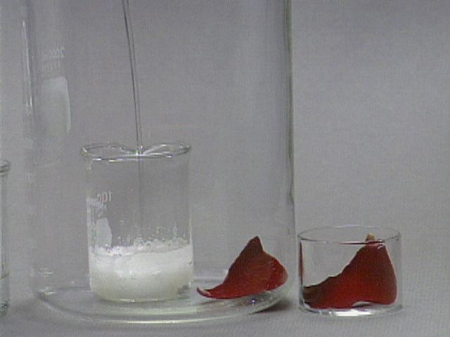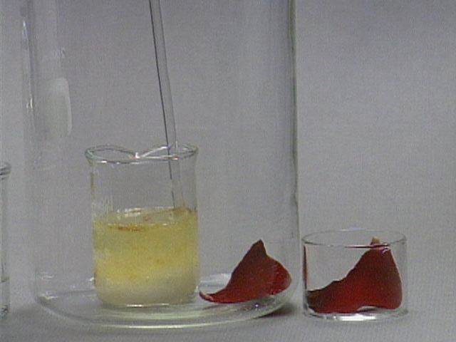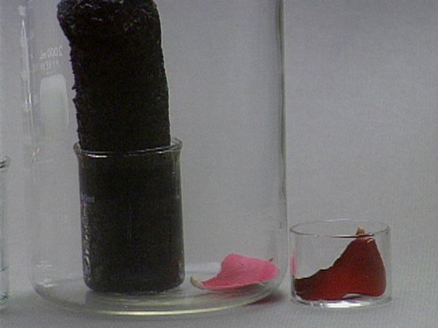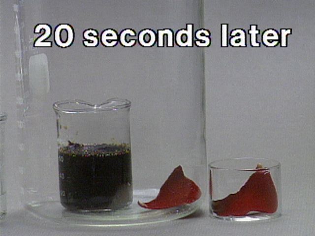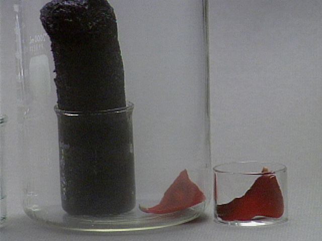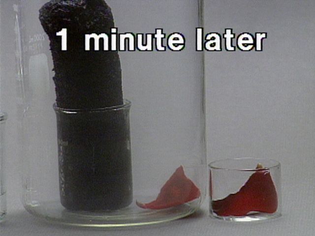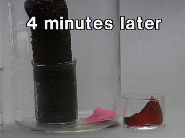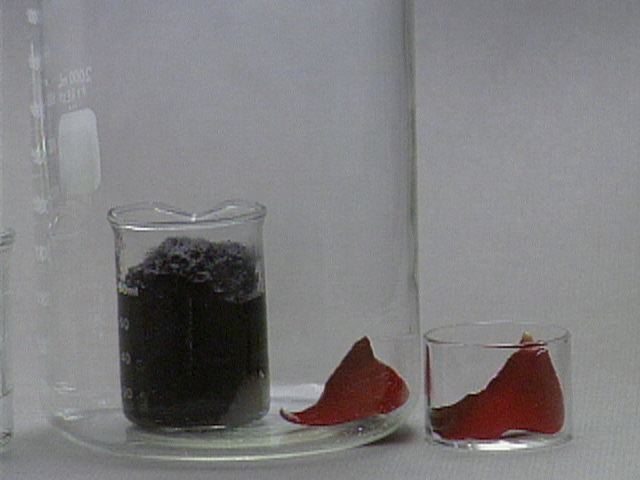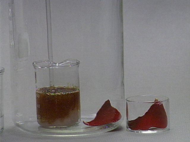 Formation of Carbon from Carbohydrate - With a Rose Petal Still Images Concentrated sulfuric acid is added to table sugar, sucrose, which had previously been mixed with water. The sulfuric acid dehydrates the sugar, a carbohydrate. The sugar turns brown due to the removal of water in this caramelization process. The remaining black solid contains mostly carbon. Steam generated in this exothermic process causes the solid mass to expand. Sulfuric acid also acts as an oxidizing agent, and is reduced to sulfur dioxide. A rose petal is bleached by the sulfur dioxide. You can get at large JPEG versions of the images by means of the following links. 0 1 2 3 4 5 6 7 8 9 10 11 12 13 14 15 16 17 18 19 20 Back to the topic