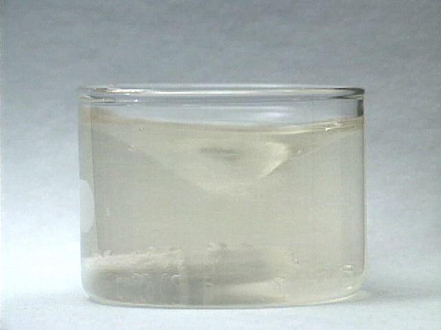 Oscillating Reaction: Briggs-Rauscher - With Stirring Still Images A solution of malonic acid, starch and manganese(II) catalyst is added to a solution of hydrogen peroxide, iodate, and sulfuric acid. A reaction involving many steps occurs. One step generates iodine, oxygen gas, and carbon dioxide gas. When the concentration of iodine gets large enough, triiodide is generated and forms a blue complex with starch. A second step uses up iodine, reversing the formation of the blue complex. As the iodine concentration oscillates, the color oscillates from colorless to amber to blue. You can get at large JPEG versions of the images by means of the following links. 0 1 2 3 4 5 6 7 8 Back to the topic